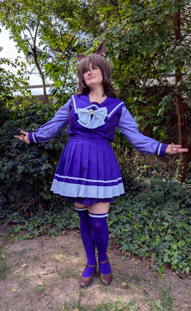As of making this costume I’m currently very obsessed with Uma Musume. After watching the movie, Tachyon became one of my favorite Uma’s. Her offputting personality really hit right for me. While working on her main racing gear, I wanted to have her winter uniform that I could wear and still cosplay her. The uniform has a dual purpose, because it means I can cosplay whatever Uma I want to, as long as I have the wig.